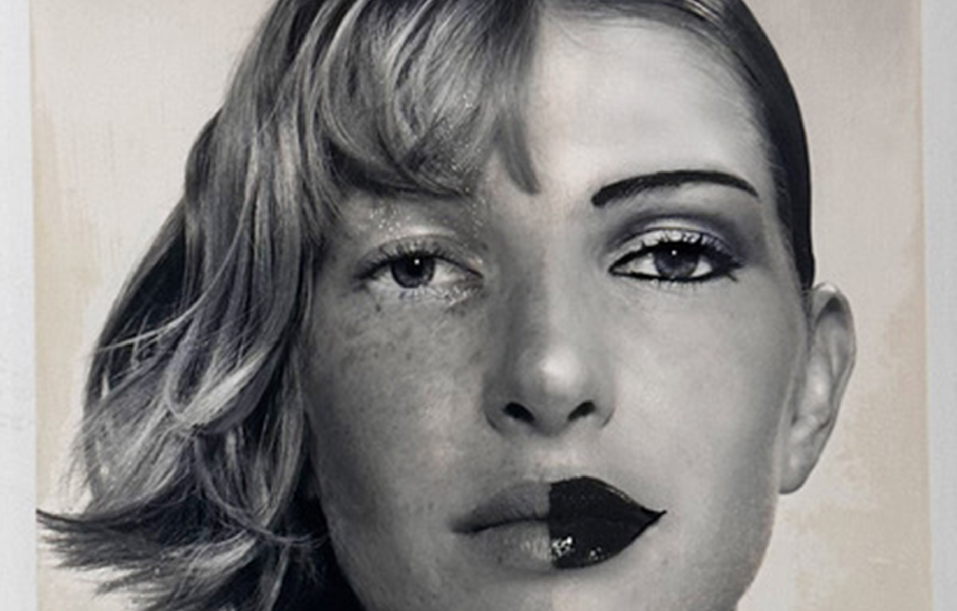 Sur la photo : une femme d’aujourd’hui. Le Botox nous permet d’être calmes, posées, inaccessibles… En noir et blanc, ce n’est pas évident, mais une moitié de son visage est rose, brute, avec des taches de rousseur, très “terre mère”, une larme coule : elle exprime l’émotion. L’autre moitié est dure, lisse, blanche, coiffée avec rigueur, avec un maquillage appuyé, liner noir, lèvres rouges. Des opposés. Ce que l’on ressent contre ce que l’on montre. Grâce au Botox, nul ne saura jamais ce que nous pensons vraiment… Merci Botox !”