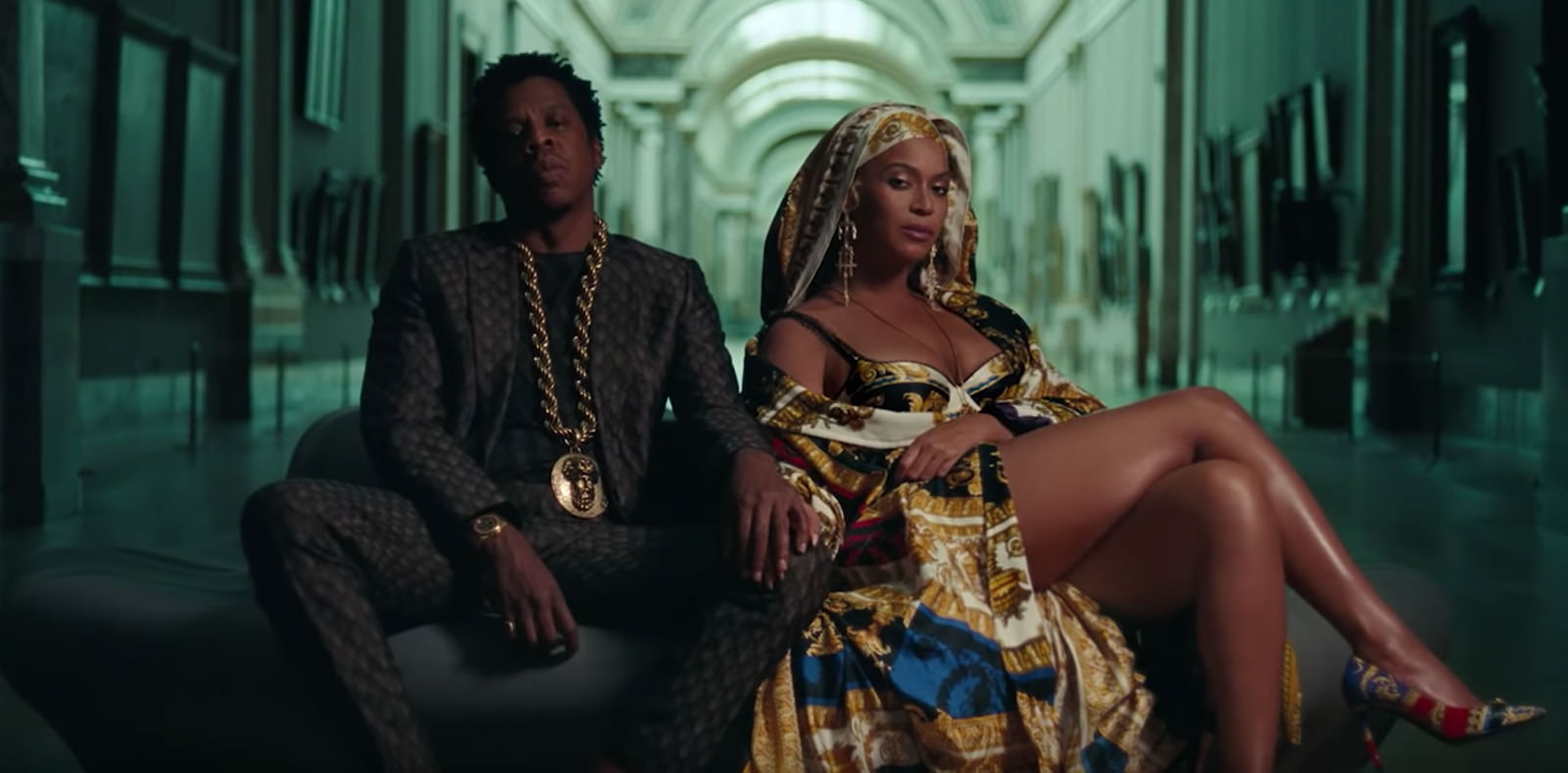 Le couple pose devant La Joconde comme pour montrer qu’ils sont aussi iconiques que Monna Lisa. Et aussi géniaux/mégalos que De Vinci ? Les danseurs noirs se meuvent dans des postures d’opposition devant des œuvres montrant principalement des blancs (Le Sacre de Napoléon de Jacques-Louis David, 1807) ; et la politique coloniale de Napoléon au XIXe siècle est remise à sa place en un mouvement du bassin par une Beyoncé trônant, sculpturale, juste en dessous de lui. Créant du contraste face à des images immobiles, Queen Bey danse en exultant toute sa puissance dans des vêtements et bijoux exubérants (comme un tailleur Peter Pilotto mauve ou une robe Versace) devant une Vénus de Milo ou une Victoire de Samothrace qui paraissent presque fade par rapport à elle. Une façon de signifier que les Carters font partie de l’histoire et qu’ils sont eux-mêmes des œuvres d’art vivantes. Mais aussi de rappeler l’ensemble du chemin parcouru à une histoire de l’art occidental qui laissait très peu de visibilité aux corps noirs. Comme le rappe le couple sur APESHIT : “I can’t believe we made it” (“Je n’arrive pas à croire que nous ayons réussi à arriver là”).