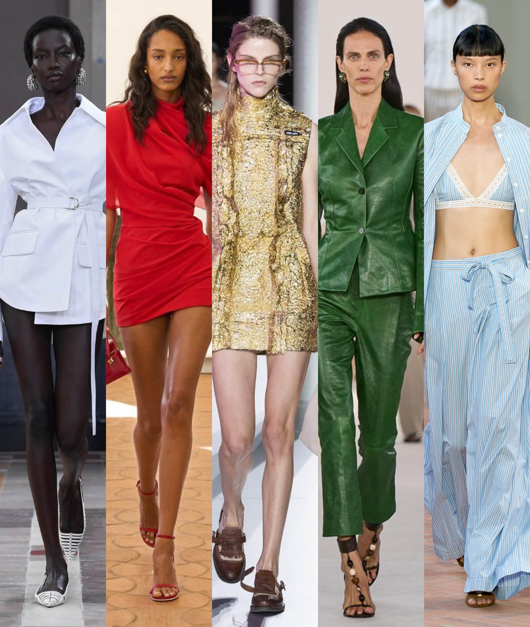 There’s nothing like a good metallic look to shine anytime of day. This spring-summer 2024, metallic hues are sported at daytime, such as Dior’s a gold mesh dress softened by a Toile de Jouy Soleil coat, Prada’s tailored shorts and silver fringed belt, or Miu Miu’s gold embossed lamé dress. Finally, we dare to wear a Rabanne silver sequined dress or a Stella McCartney seventies-inspired suit in pale gold jacquard at night.