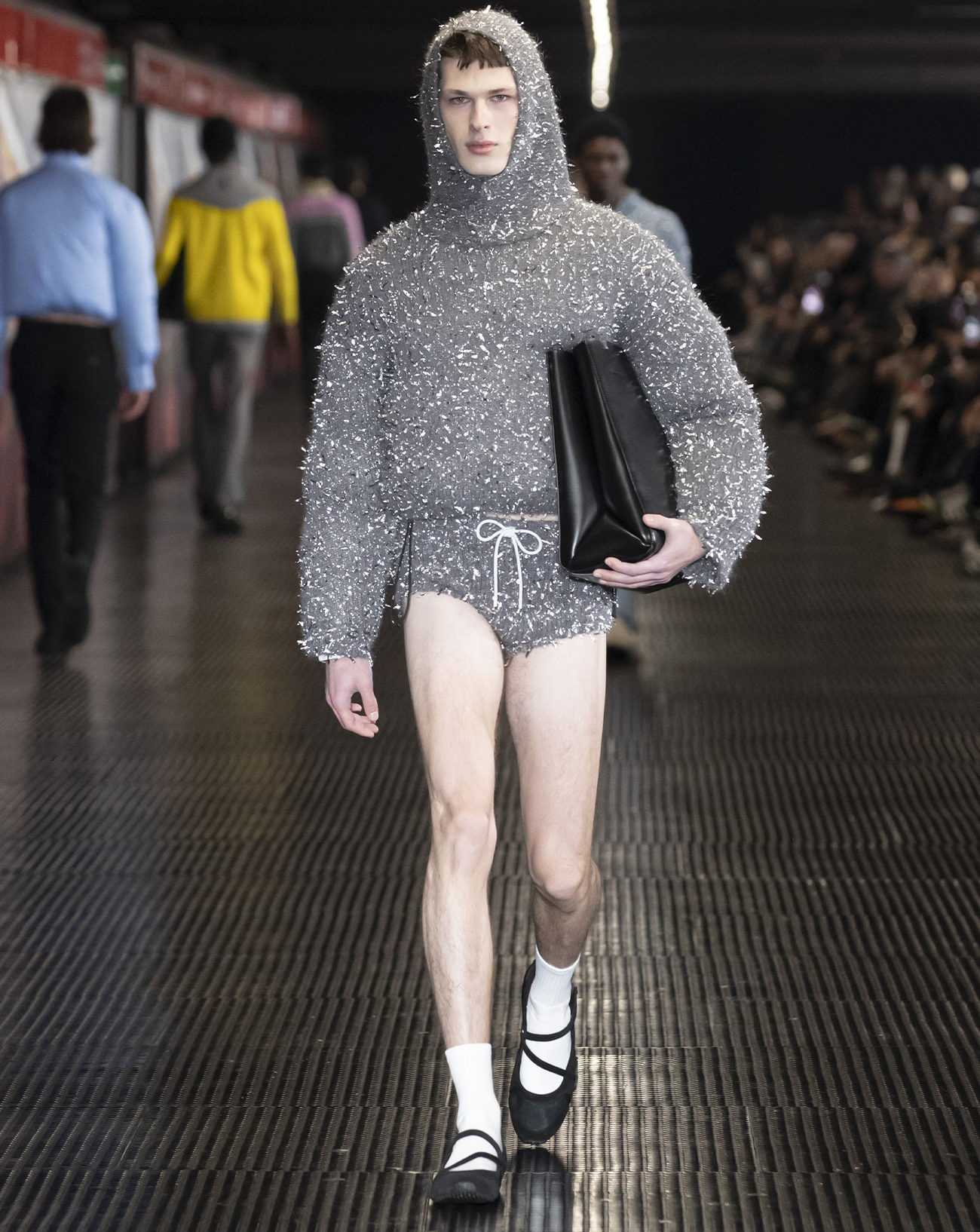 Contemporary art, artificial intelligence, motorcycles, micro-shorts… discover the joyful melting pot of inspirations from the MSGM Fall-Winter 2024-2025 men’s fashion show, held in the heart of the Milanese subway this Saturday.