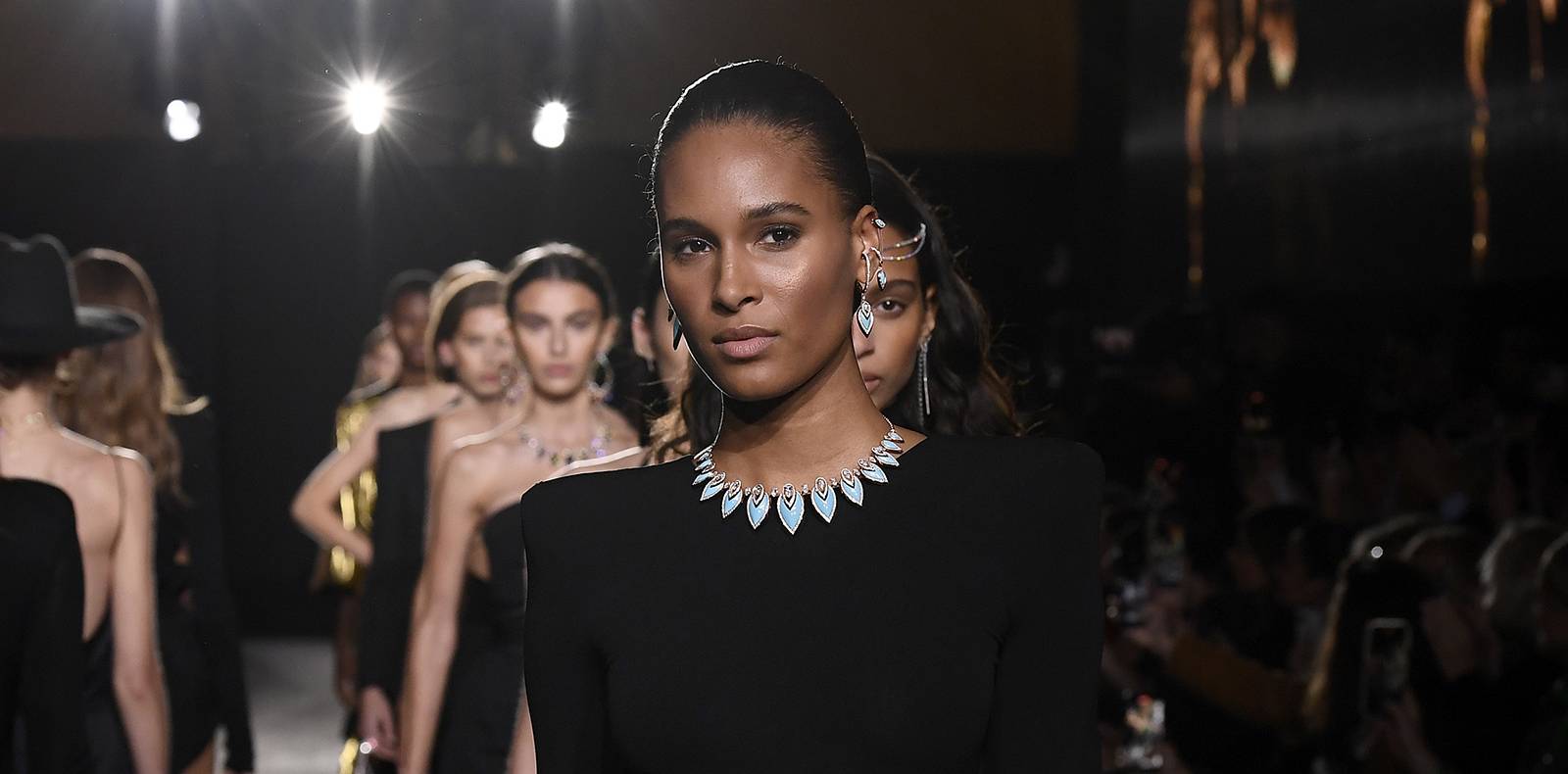 Pour ce nouveau défilé, Valérie Messika imagine un second volet à sa collection Midnight Sun, sortie l’an passé. Midnight Sun, Opus II est une célébration des soirées festives, passées à danser sans se préoccuper du lendemain. Les premières lueurs de l’aube se retrouvent dans des éclats de turquoise, parsemés ici et là, au détour d’un bijou de tête ou d’un collier à trois rangs. Comme sculpté au ras du cou, la courbe du collier White Midnight Sun mime un croissant de lune illuminant ces nuits sans fin.