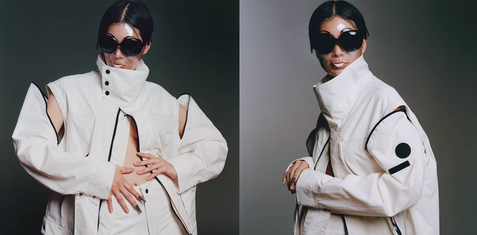 Le Japonais signe une collection mêlant les nombreuses pièces en cuir inspiration 1990 à des silhouettes futuristes. Les manteaux aux revers pointus se parent de nombreuses poches – pour cartes bleues et pour Airpods – alliant l’utile à l’élégance. Aux pieds des mannequins, des baskets à large revers estampillées du nom de la maison italienne, ou des bottes imposantes. Le monogramme Fendi, qui refait surface depuis quelques collections, s’imprime sur les manteaux, seul ou inséré dans des motifs géométriques. PLus encore, Kunihiko Morinaga apporte son savoir-faire quant aux “vêtements transformatifs“ : des manteaux en trois parties, reliées par des fermetures éclairs permettent de repenser la fourrure, qui fait partie de l’ADN de Fendi, complétés par des pièces mi-pantalon (devant) mi-jupe (derrière). Coup de théâtre, comme le designer japonais aime à en faire pour son propre label, les quatre dernières silhouettes, en totale rupture, semblent tout droit sorties d’un univers lointain : doudounes réfléchissantes accessoirisées de bobs et de moufles créent une allure ski futuriste à la luminosité éclatante.