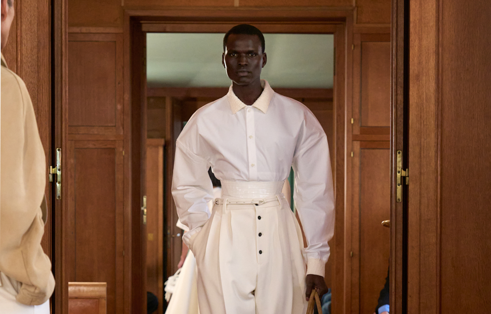 Intitulé La Croisière, le show s’est en effet tenu au sein de l’appartement de l’immense architecte français, caché en plein cœur du 16e arrondissement de Paris, un écrin Art déco boisé, qui a constitué le décor idéal pour savourer ces 41 silhouettes marquées d’une élégance singulière.