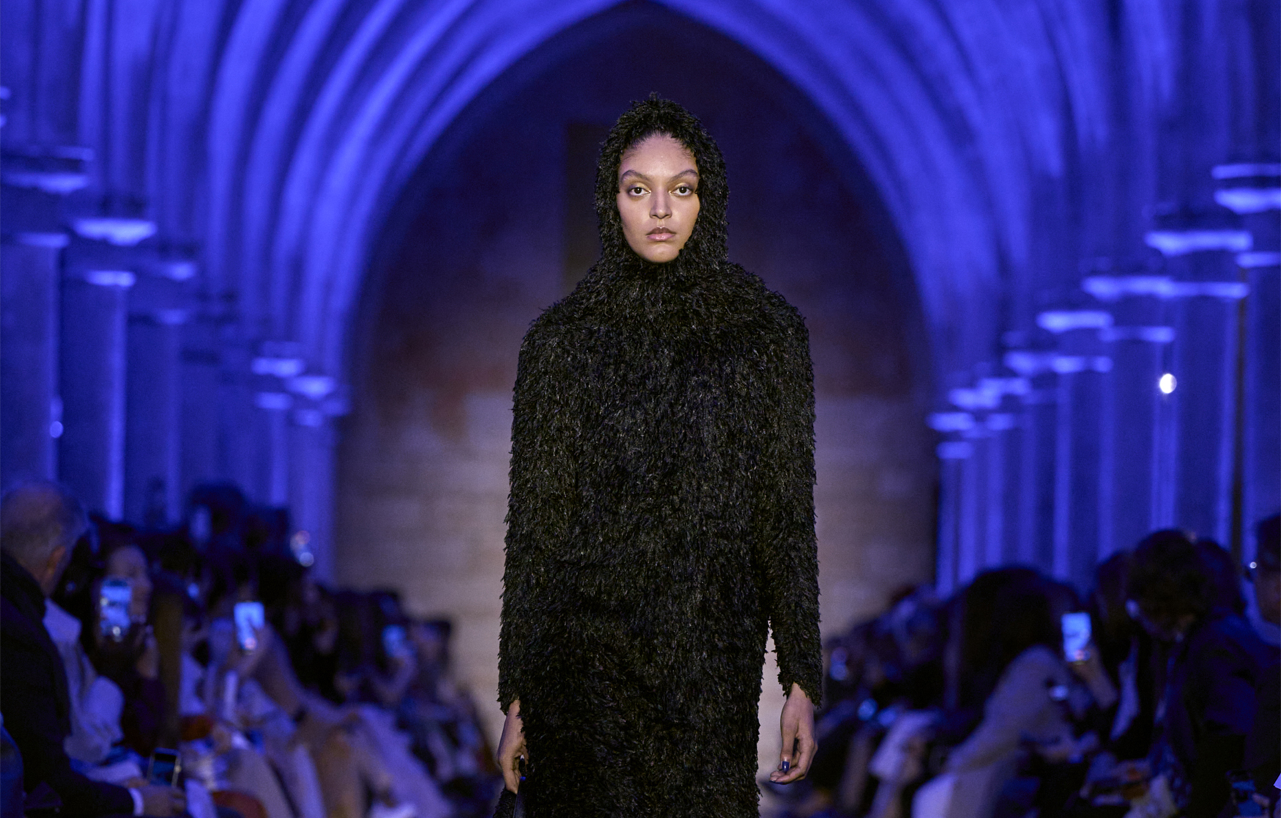 Le Collège des Bernardins plongé dans une obscurité bleue au défilé Akris