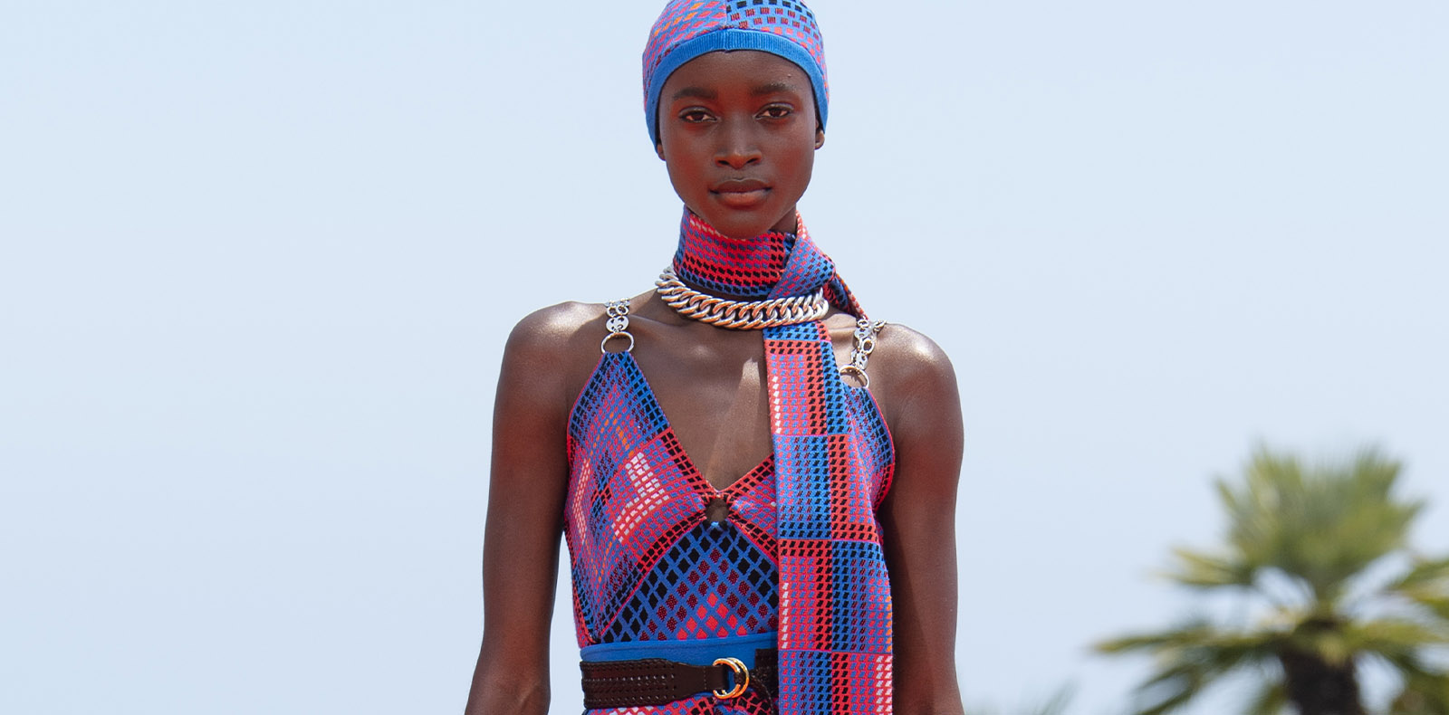 Daniel Lee has not hesitated to capture Burberry’s historical codes right from the start. As one of the pieces that has made the house internationally famous for decades, the trench coat is revamped in the very first outfits made for this Fall/Winter 2023-2024 collection. Embellished with fir green or purple fur collars, available in oversized cuts and a dark palette, these first variations move away from Burberry’s signature beige color. Further on, however, the beige trench coat has been deconstructed to become a safari dress or a shirt tucked into matching trousers under a raincoat. Daniel Lee even unveils an ingenious dress that brings the back of the trench to the front, and vice-versa, to end the piece around the neck. Following in the footsteps of his predecessors Christopher Bailey and Riccardo Tisci, the British designer reinvents the legendary Burberry tartan in a large, oblique, and all-over version on suits, turtleneck jumpers, pencil skirts, coats, and woolen wide trousers, all in unique tones – first purple, then burgundy, yellow, and finally blue on white.