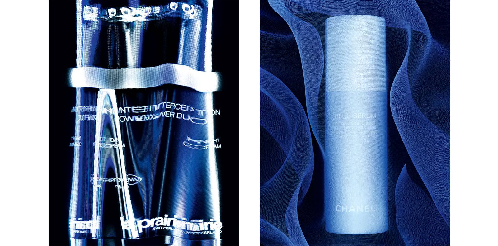 À droite : s’inspirant des “zones bleues” au sein desquelles les populations bénéficient d’une plus grande longévité, ce sérum protège toutes les peaux à long terme. La formule contient des extraits des végétaux spécifiques à ces lieux privilégiés et dotés de propriétés reconnues. Au menu de la peau : café vert du Costa Rica antioxydant, olive de Sardaigne riche en acides gras, en omégas (3, 6 et 9), en antioxydants et en polyphénols, et lentisque de Grèce régénérant. Sous cet halo de bienfaits, la peau retrouve fermeté, jeunesse et uniformité. “Blue Serum”, CHANEL.